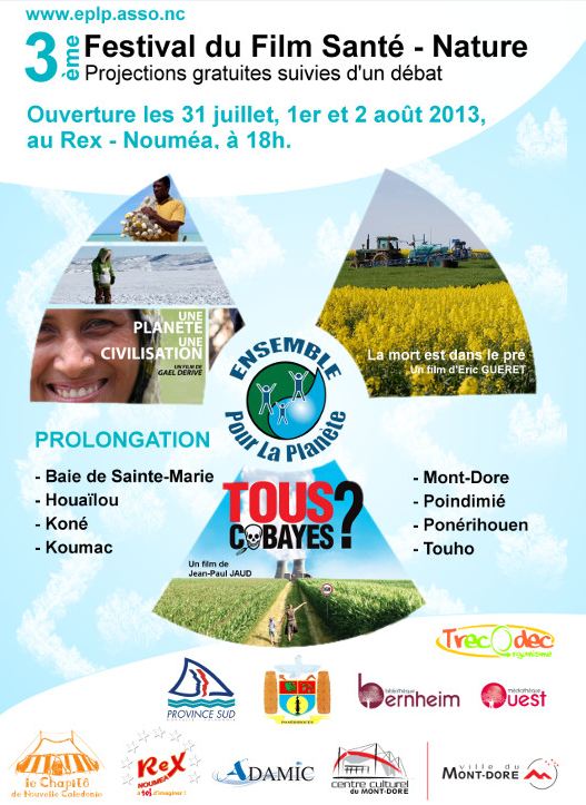 L'association Ensemble pour la planète (EPLP) organise la troisième édition du Festival du Film Santé - Nature. Durant trois jours, les films seront projetés au Rex à Nouméa et suivront des projections en brousse (Mont-Dore, Koné, Ponérihouen, etc.) À cette occasion, trois films sont mis à l'honneur: "Une planète, une civilisation" de Gaël DERIVE - 80 mnLa rencontre des hommes et des femmes au sein des 6 principaux climats. Un nouveau regard sur les problèmes globaux humains et écologiques dans un contexte de dérèglement climatique. "Tous cobayes" de Jean-Paul JAUD - 115 mnSommes-nous tous des cobayes? Deux problèmes majeurs : les OGM et le Nucléaire. "La mort est dans le pré" d'Eric GUERET - 59 mnEnquête sur les conséquences de l'utilisation des pesticides pouvant provoquer des maladies graves chez les agriculteurs. Pour télécharger le programme complet, cliquer ici |