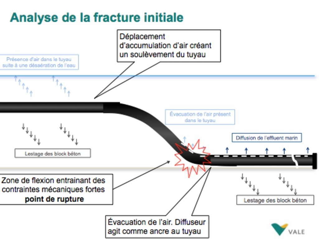 - L’hypothèse la plus probable pour expliquer les fractures selon Vale Nouvelle-Calédonie était une accumulation d’air dans l’émissaire. Elle aurait entrainé une mise en flottaison du tuyau alors exposé aux contraintes des courants et de la houle. | Cette hypothèse a été confirmée par la mission d'expertise technique requêtée par la province Sud et réalisé par Tecnitas, avec l'assistance de Vale Nouvelle-Calédonie et Géocéan dans la fourniture de documents, notes techniques, notes de calculs, etc. La phase de terrain, achevée le 18 décembre dernier a également permis de présenter les solutions techniques à apporter pour la réparation de l'émissaire.