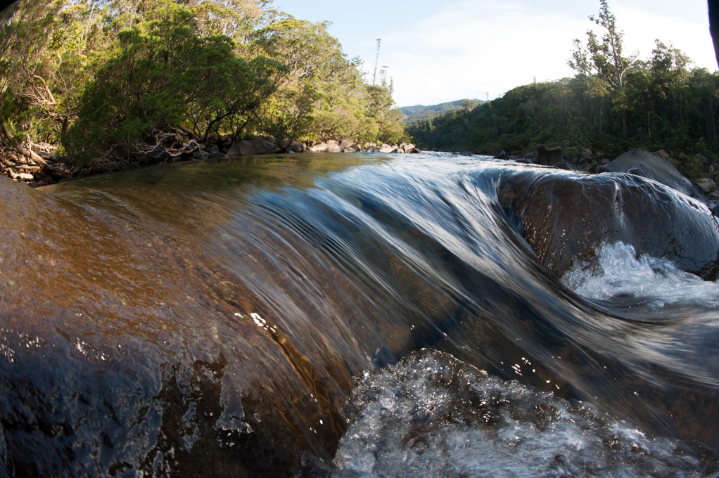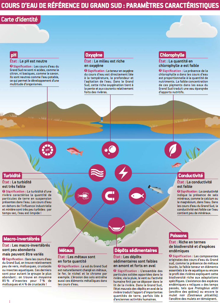 Dans le Grand Sud, une rivière, hors d’influence des activités humaines actuelles, apparaît limpide, riche en oxygène et particulièrement chargée de métaux. La clarté de l’eau tient notamment à la faible quantité de particules de terre en suspension dans le cours d’eau. La riche oxygénation de l’eau est plutôt la conséquence des pentes et courants relativement forts des rivières. Enfin, la forte teneur en métaux de l’eau s’explique par le simple fait que le sol du Grand Sud est naturellement chargé en métaux, le fer, le nickel et le chrome