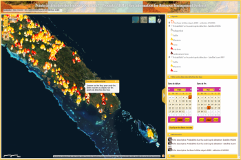 Attention les feux détectés sont uniquement les plus importants en superficie et en durée. La carte n'est pas exhaustive en raison notamment de la couverture nuageuse, plus particulièrement sur la chaîne empéchant les prises de vue, et de la taille du pixel (500m) pour les données du satellite MODIS, (375m) pour celles du satellite SUOMI NPP.