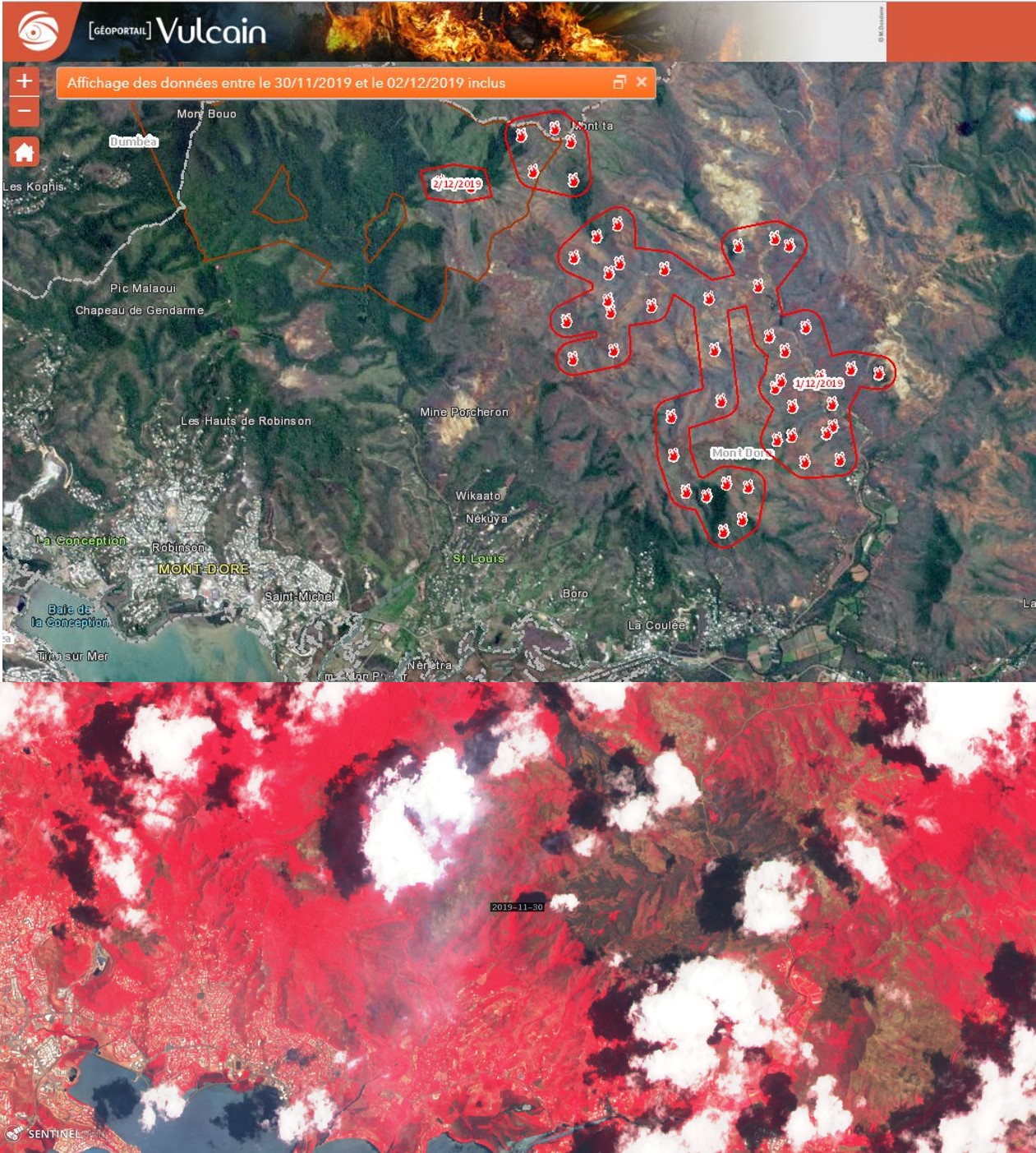 Avec l’évènement en cours, le Mont-Dore occupe la 11ème position, mais pourrait bien remonter ce triste classement dans les heures à venir. Ci-dessous, les images issues du géoportail Vulcain en date du 2 décembre 2019, et la photographie prise par Sentinel le 30 novembre 2019, où l’on peut voir l’empreinte de l’incendie en cours (tâche sombre) ainsi que le panache de fumée qui se dégage du front.