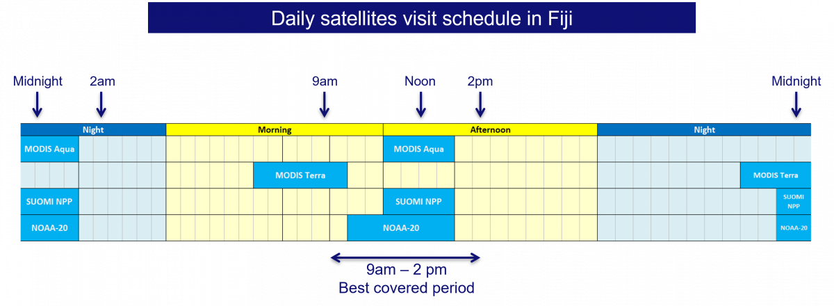 The service is based on a pre-existing NASA service that provides fire alerts daily for a given area. The Observatory has developed an automated processing chain that integrates data from four satellites: Aqua MODIS, Terra MODIS, Suomi NPP and NOAA-20. The three of their trajectories cumulated fly over Fiji minimum 6 times a day, with a concentration on the 9am to 2pm slot. Mid-afternoon fires are less well monitored.